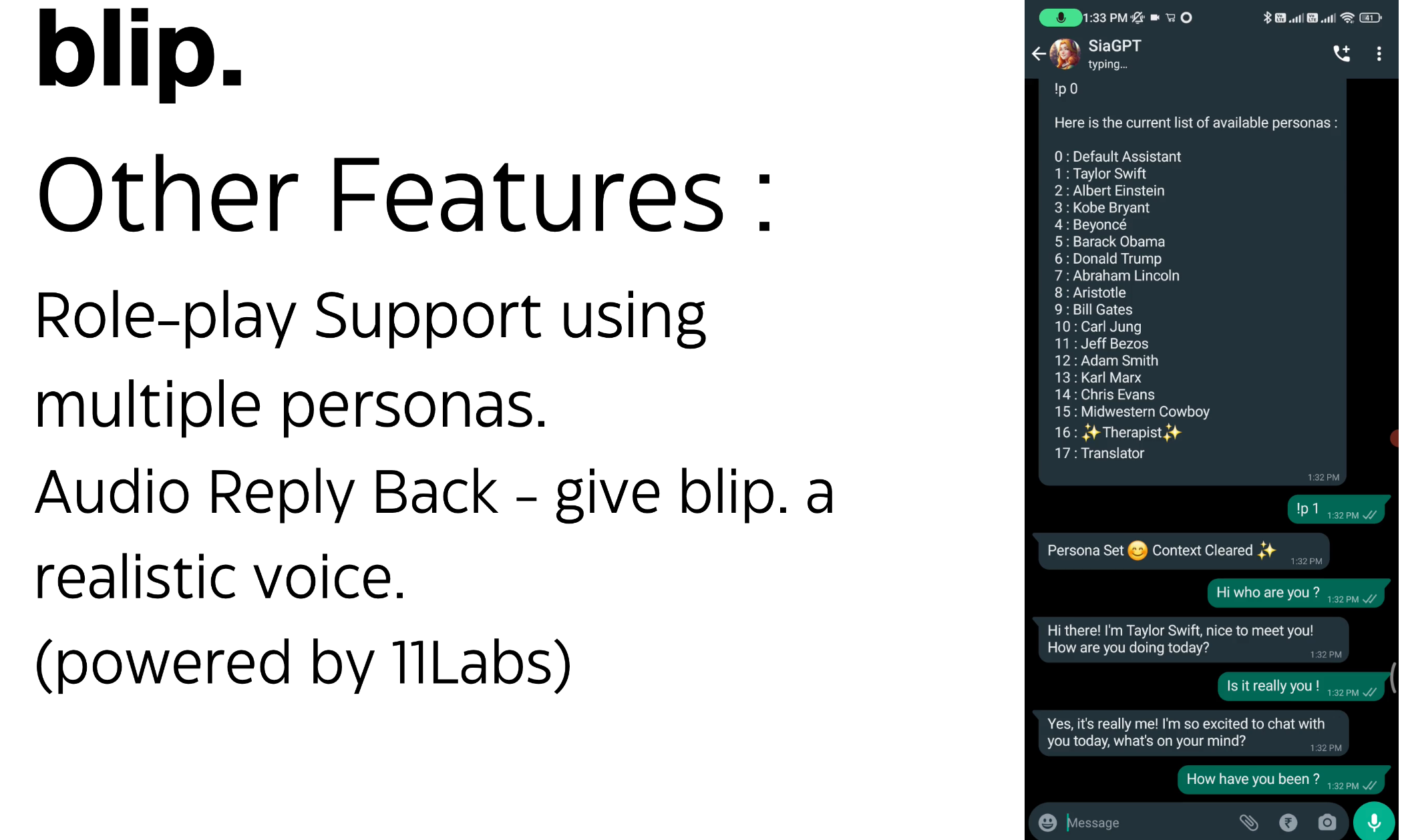 Give blip. multiple personas. Make blip. talk to you like its Einstein, Tylor Swift, Saul Goodman and more.